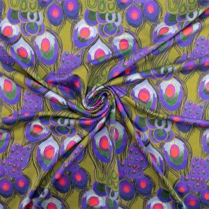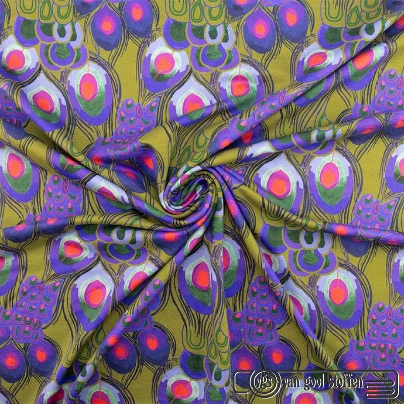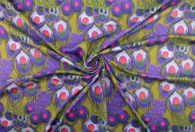 Katoen tricot digitaal pauwen veren lime groen paars
