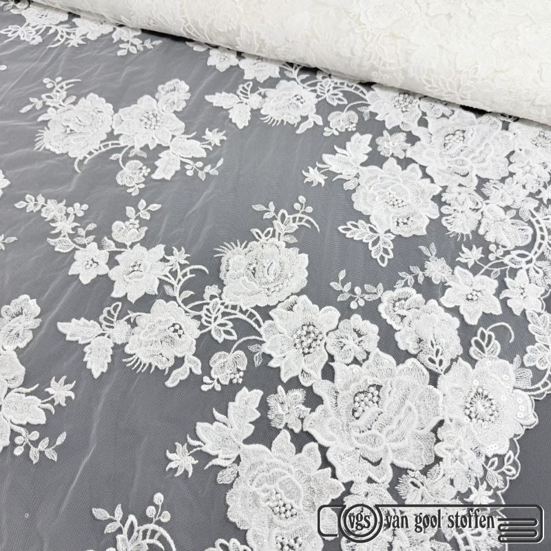 Couture kant met grote bloemen bewerkt met pailletten ivory
