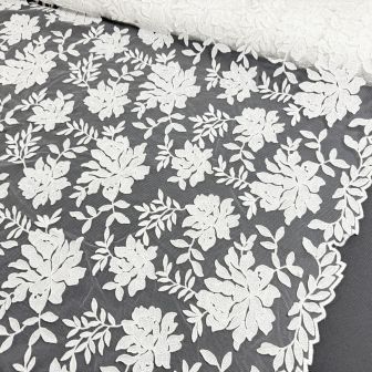 Deze exclusieve haute couture bruidskant straalt pure elegantie en verfijning uit. De stof is rijkelijk bewerkt met grote bloemmotieven, verfijnd afgewerkt met glinsterende kralen en pailletten die zorgen voor een subtiel en luxueus spel van licht.