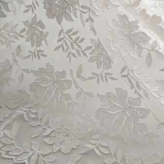 De zachte ivory tint geeft de stof een romantische en tijdloze uitstraling. Dankzij de hoogwaardige samenstelling valt de kant soepel, terwijl zij tegelijkertijd structuur en luxe behoudt – perfect voor exclusieve bruidscreaties en couture toepassingen.