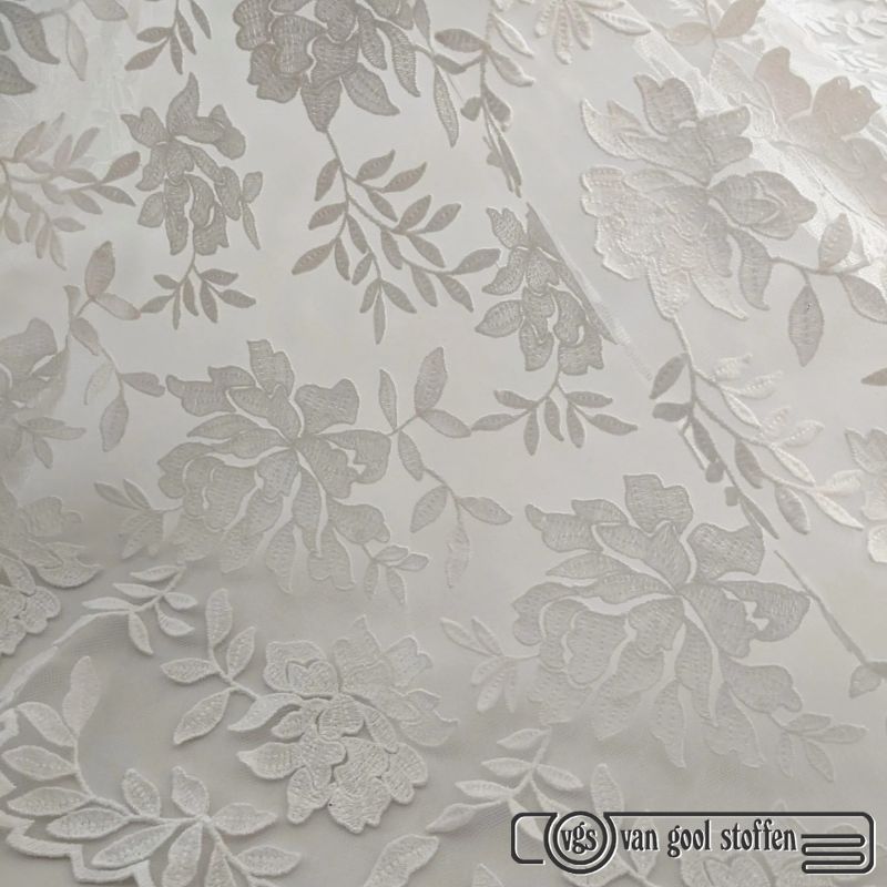 Het ontwerp kenmerkt zich door een prachtige border print waarbij de bloemen aan de rand groot en expressief zijn en geleidelijk overgaan naar kleinere, fijnere motieven richting het midden van de stof. Dit maakt de kant bijzonder geschikt voor bruidsjurken met een indrukwekkende zoom, sleep of couture details.