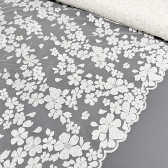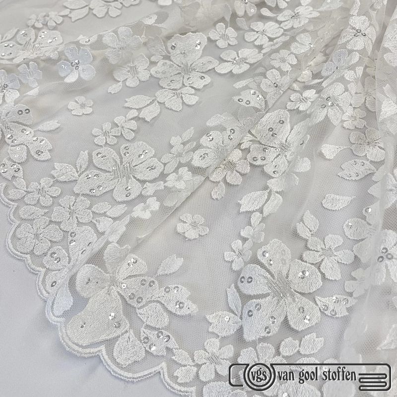 Het ontwerp kenmerkt zich door een prachtige border print waarbij de bloemen aan de rand groot en expressief zijn en geleidelijk overgaan naar kleinere, fijnere motieven richting het midden van de stof. Dit maakt de kant bijzonder geschikt voor bruidsjurken met een indrukwekkende zoom, sleep of couture details.