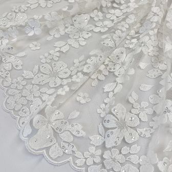 Deze exclusieve haute couture bruidskant straalt pure elegantie en verfijning uit. De stof is rijkelijk bewerkt met grote bloemmotieven, verfijnd afgewerkt met glinsterende kralen en pailletten die zorgen voor een subtiel en luxueus spel van licht.
