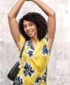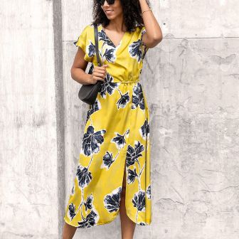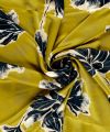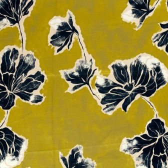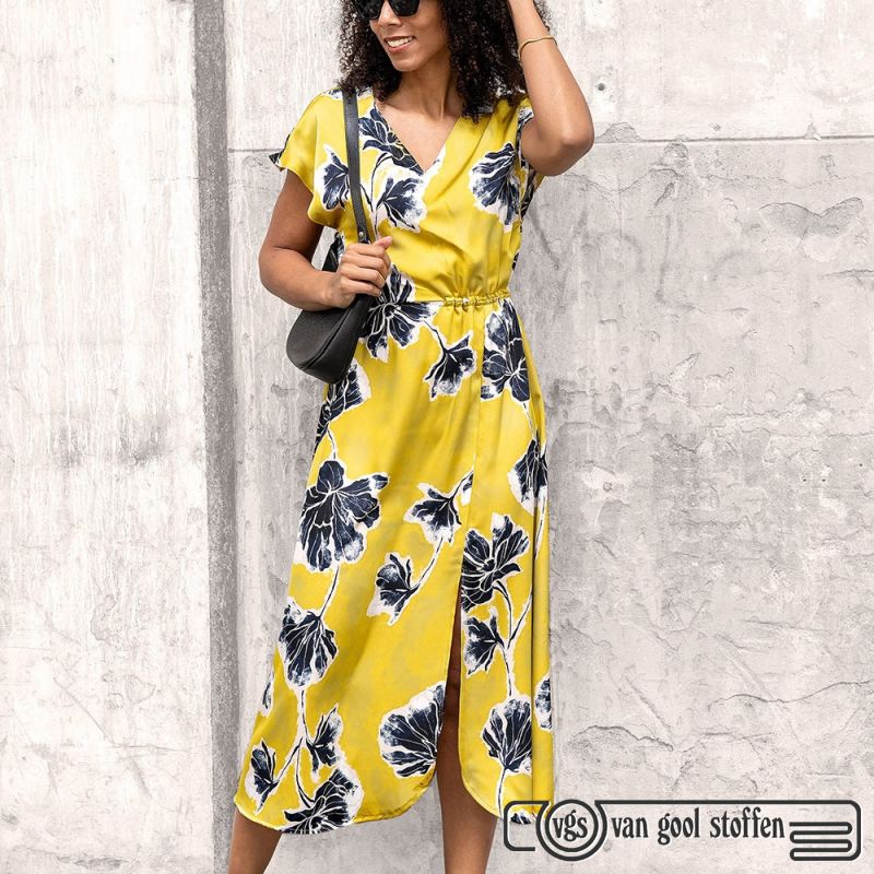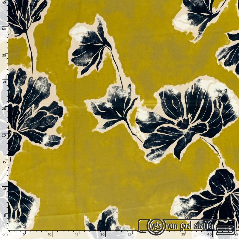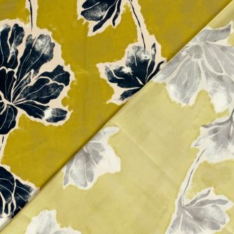 Satijn met bloemen print donker geel