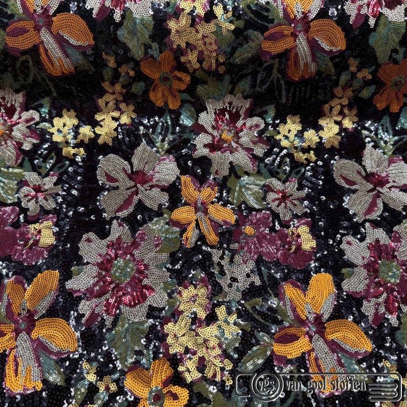 Pailletten bewerkt op zwarte stretch tule barok style patroon
