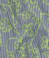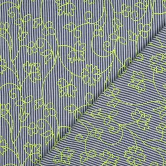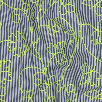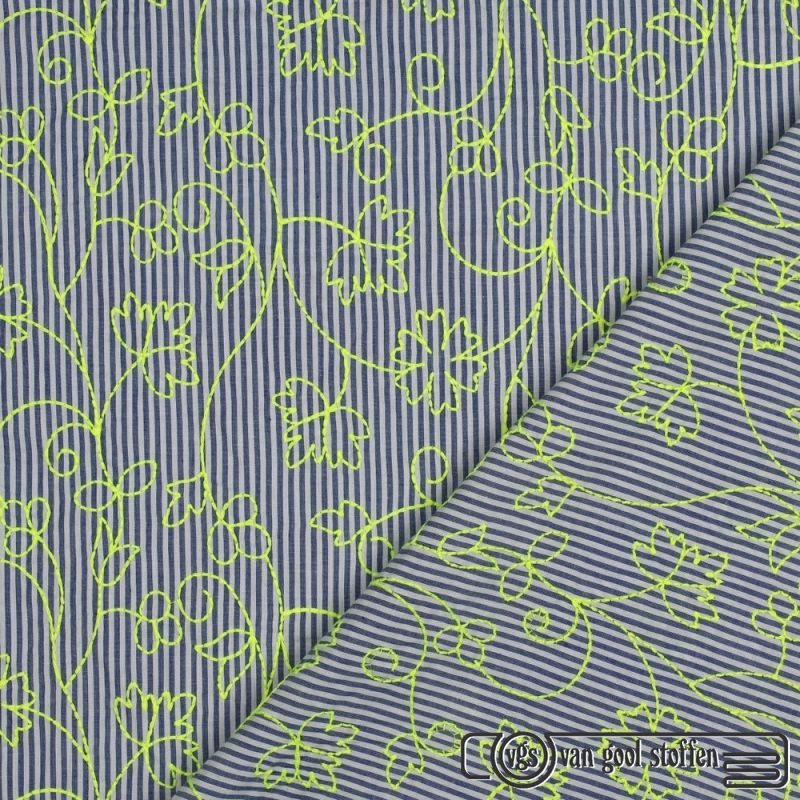 Voeg een frisse, zomerse touch toe aan je garderobe met deze katoenen stof. De stof heeft een klassieke blauw-witte streep gecombineerd met opvallende neon borduring in groen/geel, perfect voor blouses, jurken, rokken en andere zomerse kledingstukken.
