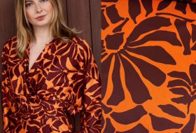 Stretch satijn bloemen print oranje burgundy A la Ville / knipmode