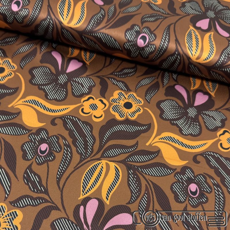 Satijn stretch bloemen print caramel bruin A la Ville / knipmode