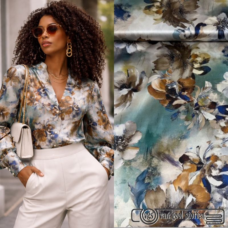 Exclusieve stretch zijde Italiaans design bloemen print camel petrol