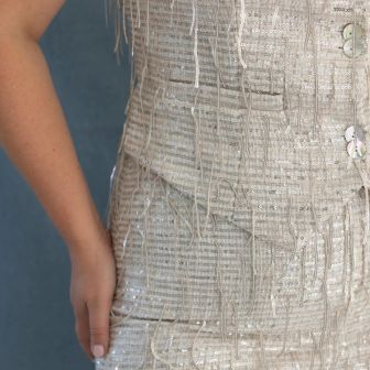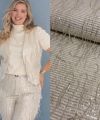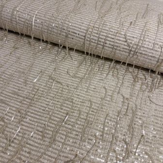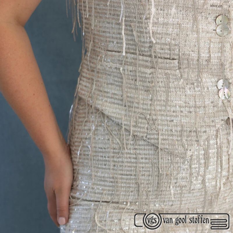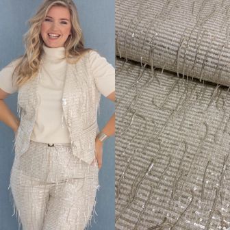 Deze exclusieve stof is een echte eyecatcher voor stijlvolle mantelpakjes en couture-achtige creaties. De grove weving geeft de stof een rijke structuur, terwijl de subtiel verwerkte pailletten en speelse sliertjes/franjes zorgen voor een verfijnde, luxueuze uitstraling.
