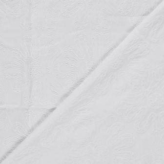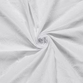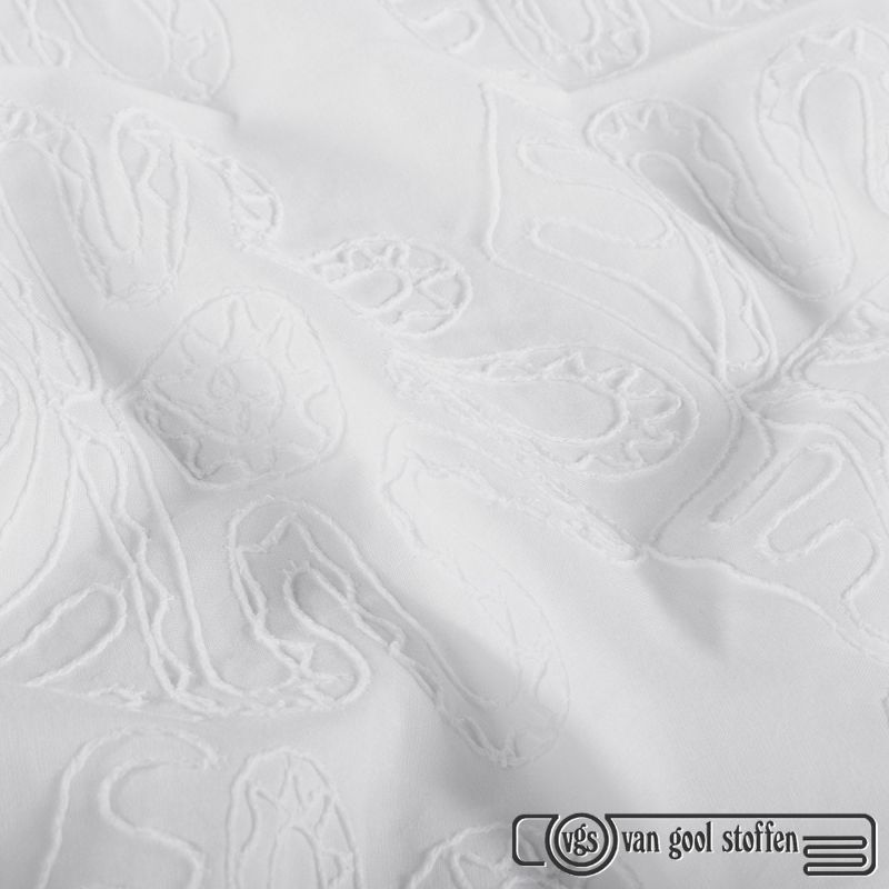 Met een gewicht van 150 g/m² heeft deze stof een mooie balans tussen stevigheid en soepelheid. De ademende en huidvriendelijke eigenschappen van katoen zorgen voor optimaal draagcomfort. Het geborduurde detail geeft een luxe en ambachtelijke uitstraling, ideaal voor zowel casual als meer geklede kledingstukken.