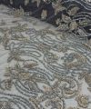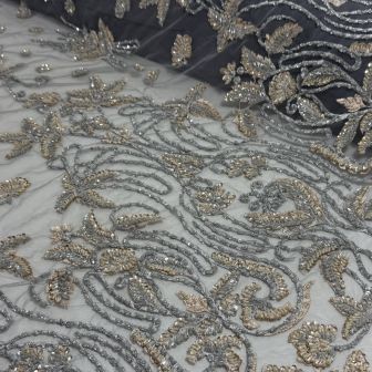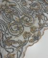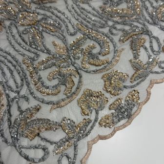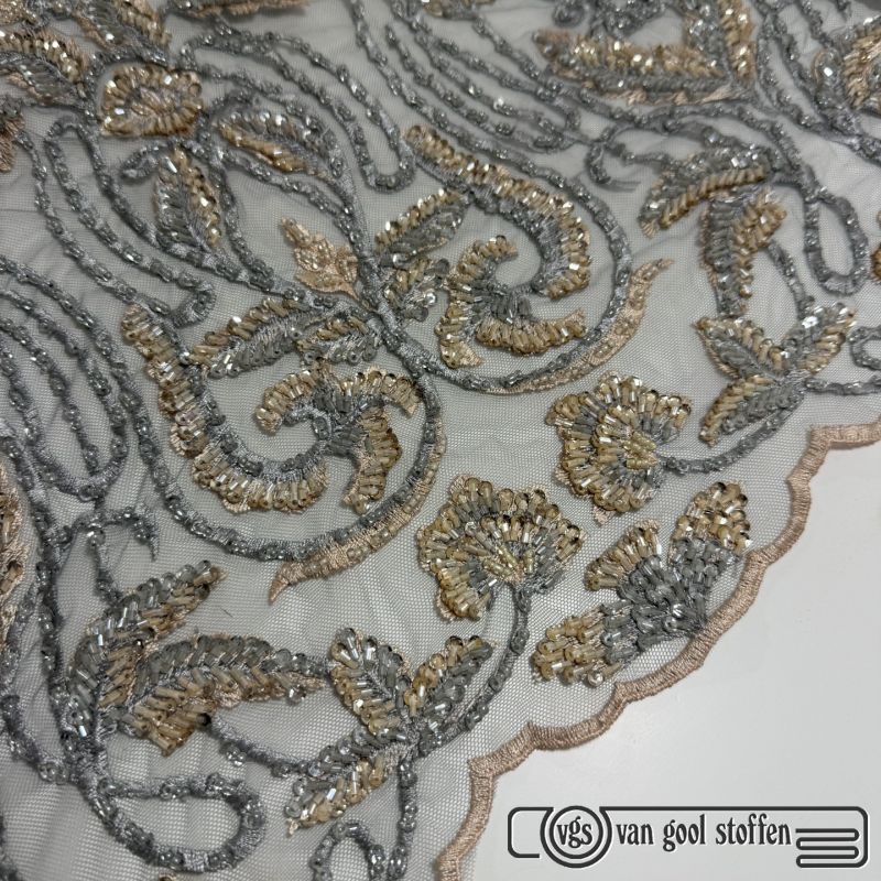Deze verfijnde haute couture kant is vervaardigd op een zachte grijze tule basis en straalt pure elegantie uit. De stof is rijkelijk bewerkt met kralen en pailletten in zilver, grijs en beige tinten, wat zorgt voor een subtiele maar luxueuze schittering.