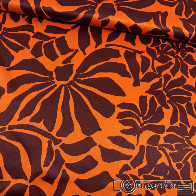 Stretch satijn bloemen print oranje burgundy A la Ville / knipmode