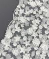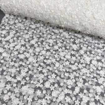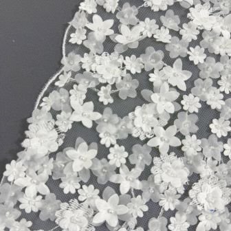 Maak een statement met dit uitzonderlijke haute couture 3D kant. Op een zachte tule-basis zijn gelaserde ivory bloemen geplaatst en subtiel afgewerkt met parelaccenten — een combinatie die direct luxe, diepte en verfijning toevoegt aan elk ontwerp.