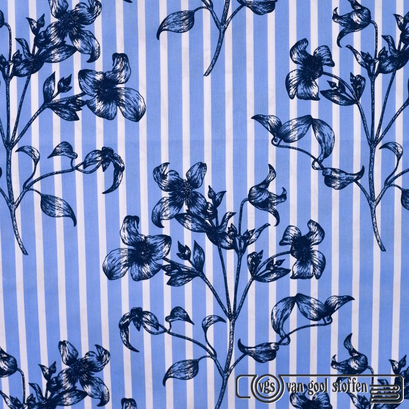 Katoen stretch streep blauw wit met bloemen
