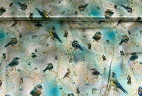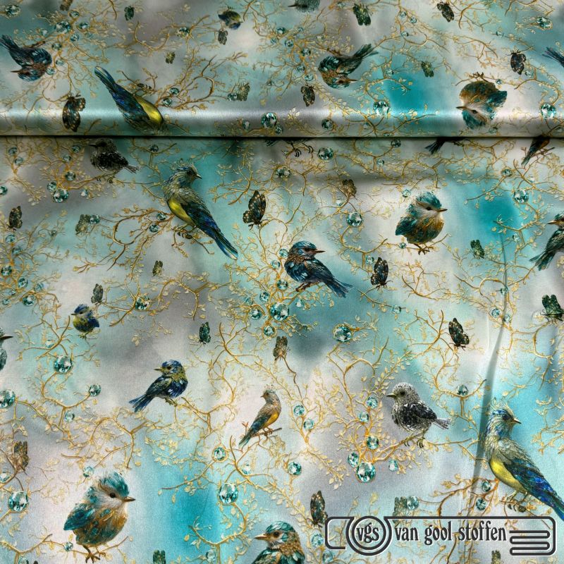 Exclusieve stretch zijde Italiaans design vogels petrol /mint