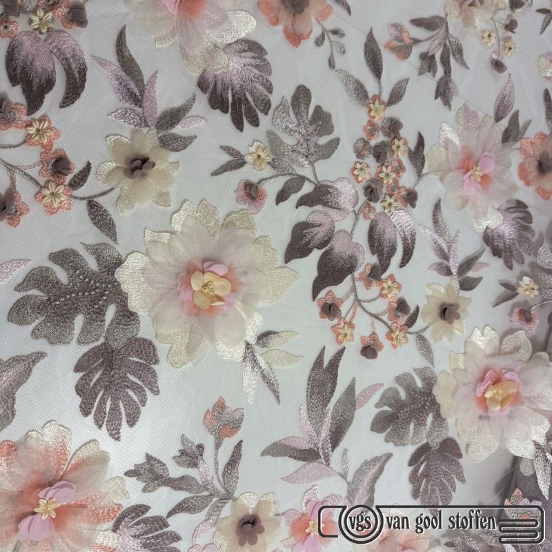 Exclusieve 3D kant verwerkt op tule pastel tinten