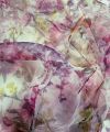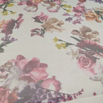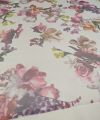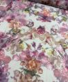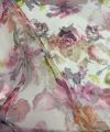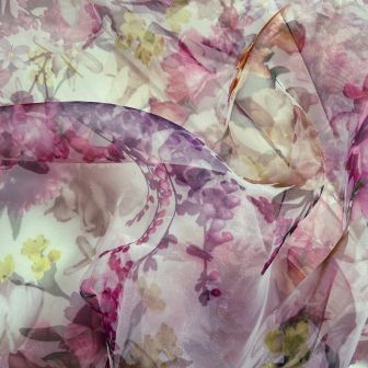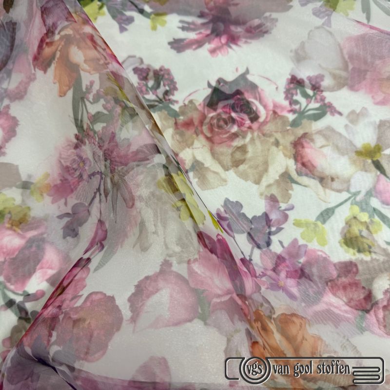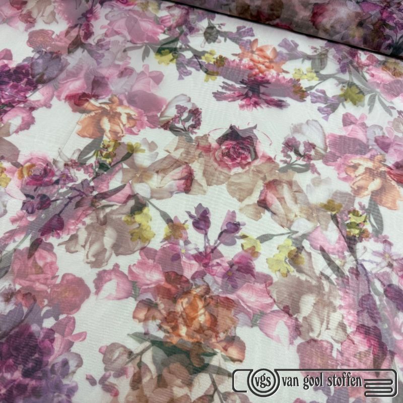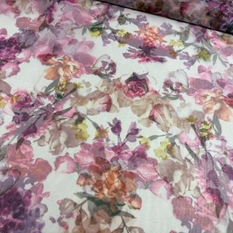 Deze prachtige en luxe organza stof heeft een verfijnd bloemendessin in rijke magenta- en cerisetinten. De stof is licht, soepel en licht doorschijnend, wat zorgt voor een elegante en romantische uitstraling.