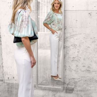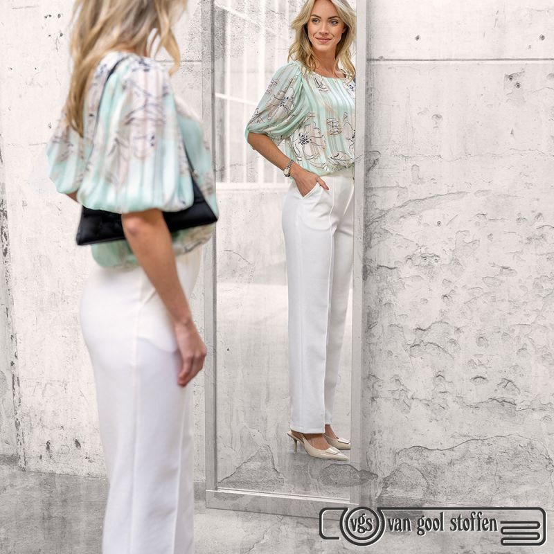 Deze stof wordt gebruikt in het patronenblad My Image en is daarin verwerkt als broek en top, wat de veelzijdigheid en kwaliteit van deze stof benadrukt.